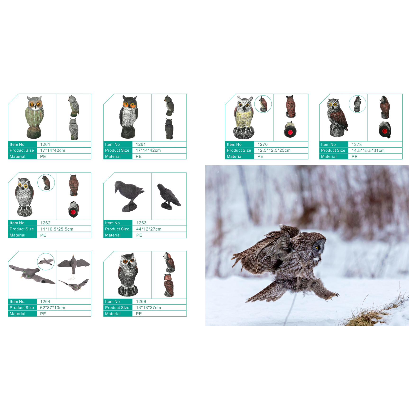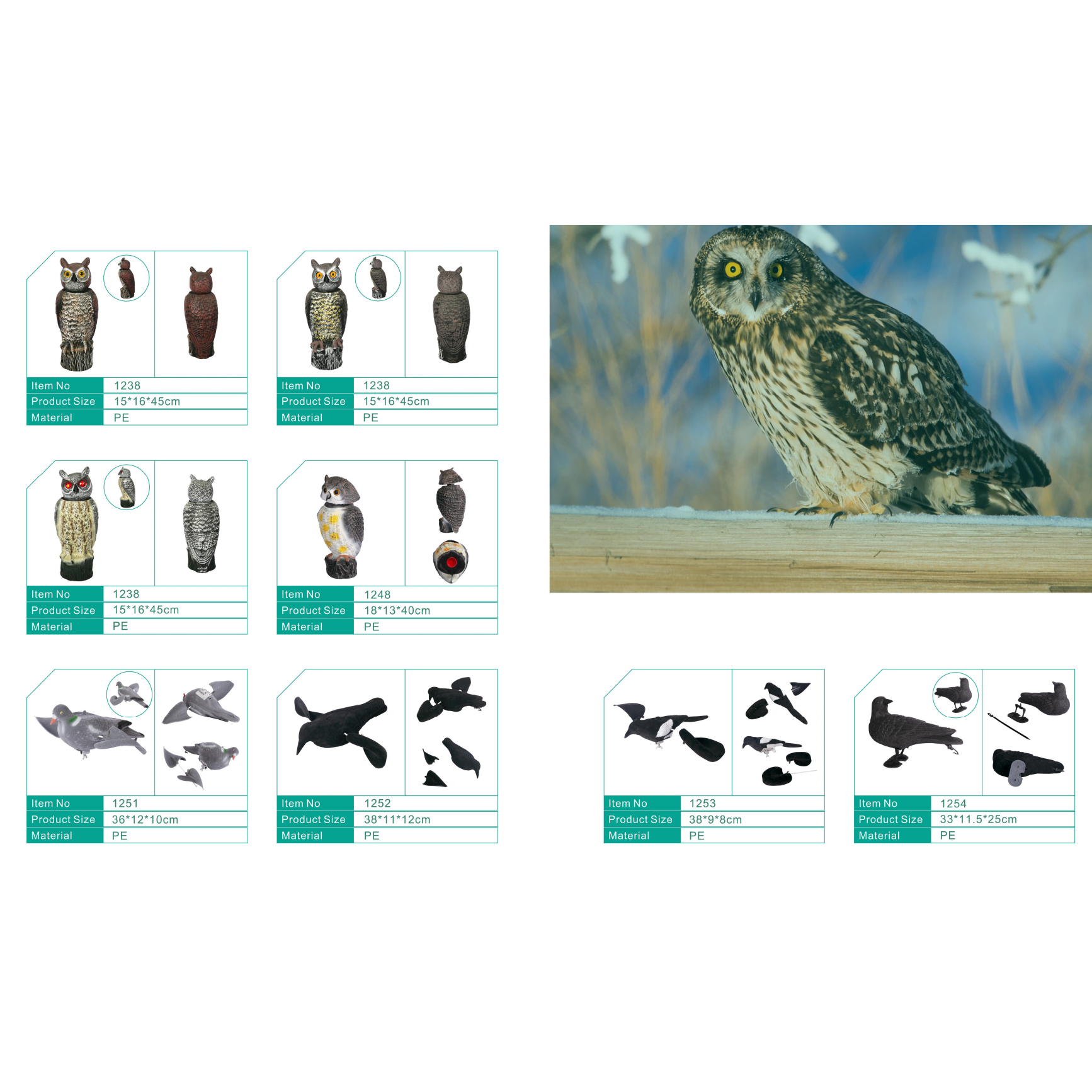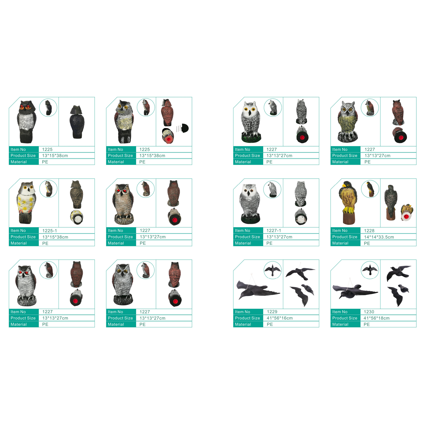 Our animal decoy range is designed to meet the diverse needs of overseas buyers, offering realistic solutions for garden, hunting, and wildlife management applications. The collection includes lifelike owl decoys, eagle decoys, duck decoys, snow goose decoys, pigeon decoys, magpie decoys, flamingos, herons, cranes, and more.